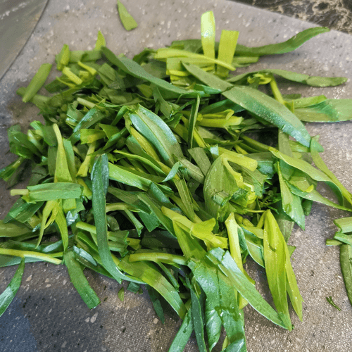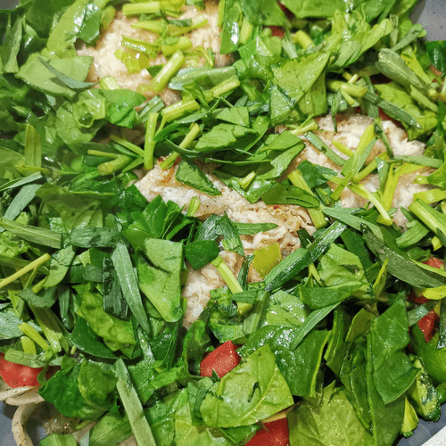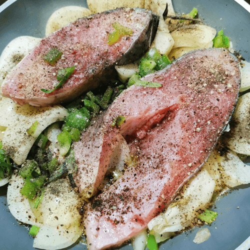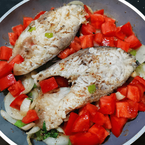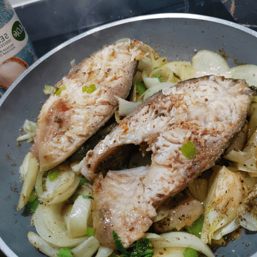 Через 4–5 минут убавить огонь до среднего, перевернуть рыбу, перемешать лук и перец. Посолить.