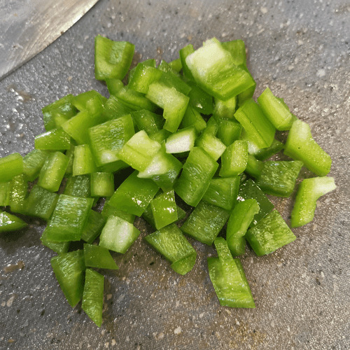 В масло также добавить лук и сладкий перец. Приправить черным и белым перцем.