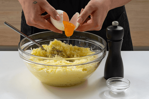 Пюре посолить и поперчить по вкусу и вмешать яйцо.