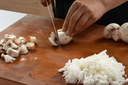 Мелко нарезать лук, шампиньоны крупно нарезать.