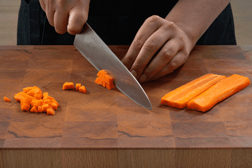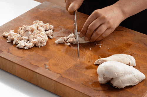 Вареную курицу нарезать небольшим кубиком со стороной около 1 см.