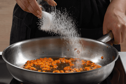 Морковь обжарить в той же сковороде, добавив растительного масла, до мягкости, затем добавить сахар и глазировать на сильном огне.