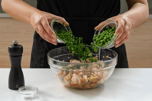 Подготовить все ингредиенты. Горошек достать из морозилки.