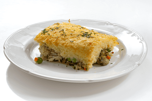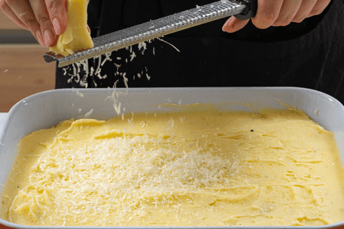 Выложить эту смесь в форму для выпечки, сверху выложить пюре.