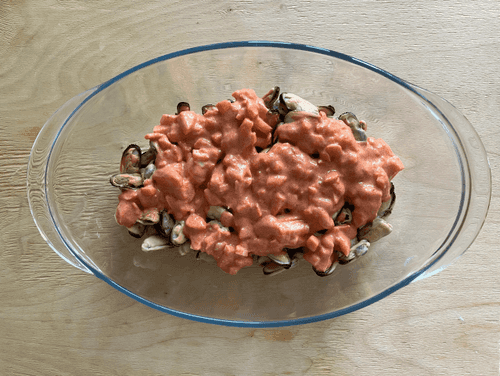 Мидии выложить на дно формы для запекания. Сверху выложить слой из лука и соуса. Поставить в разогретую до 200 градусов духовку на 30 минут.