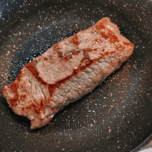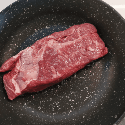 На сухую раскаленную сковороду с щепоткой крупной соли выложить стейк.