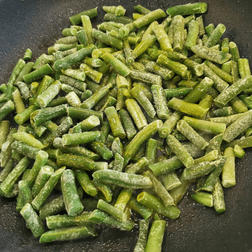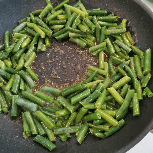 Стручковую фасоль выложить в разогретое на сковороде масло с щепоткой крупной соли.