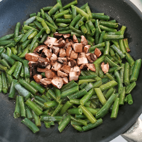 Через 3–4 минуты перемешать и сдвинуть фасоль так, чтобы освободить место для грибов.