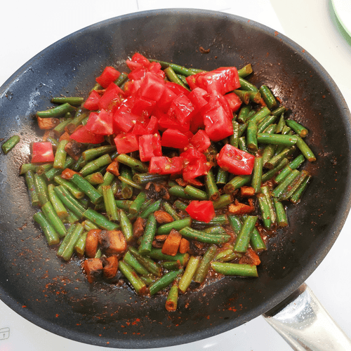 Через минуту добавить помидоры. Перемешать. Обжаривать еще 2–3 минуты под крышкой, затем снять с огня.