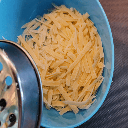 Пармезан натереть на крупной терке.