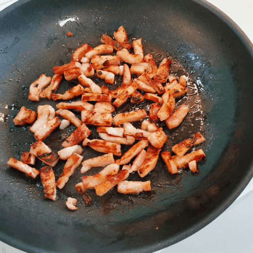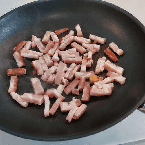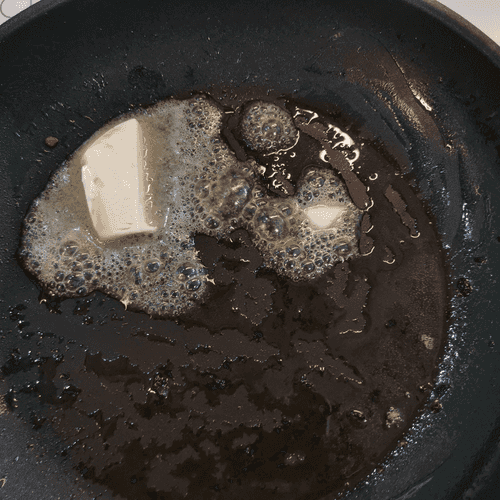 Переложить и пока отложить грудинку. Добавить на сковороду сливочное масло.