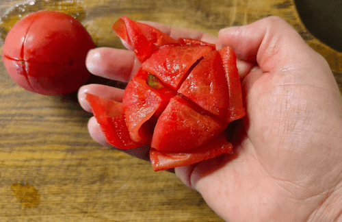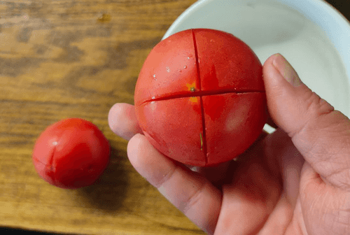 Помидор надрезать крестообразно с нижней стороны.