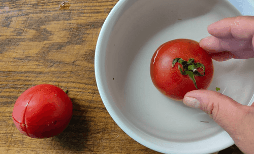 На пару минут помидор положить в горячую воду.