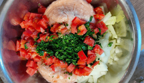 Домашние котлеты с луком и помидорами – это классика русской кухни, которая восхищает своей простотой и вкусом. Исторически котлеты появились в России как адаптация западноевропейских рецептов, но приобрели свою уникальную идентичность. В данном варианте куриный фарш сочетается с сочными помидорами и ароматным луком, создавая нежную текстуру и насыщенный вкус. Тщательно обработанный лук теряет горечь, а помидоры, очищенные от кожицы, придают котлете особую мягкость. При жарке на среднем огне образуется золотистая корочка, удерживающая соки внутри, а укроп и петрушка добавляют свежие травяные нотки. Эти котлеты идеально подходят для семейного ужина или уютного застолья, прекрасно сочетаясь с картофельным пюре, свежими овощами или нежными соусами.