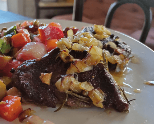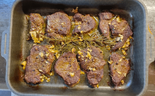 Говядина с розмарином и луковой заправкой — это изысканное блюдо европейской кухни, сочетающее простоту приготовления с богатством вкуса. Нежная говяжья вырезка, пропитанная ароматом свежего розмарина и пикантностью смеси перцев, запекается с кусочками сливочного масла, придавая мясу невероятную сочность. Легкая острота чеснока дополняет мясо, а карамелизированный лук и розмарин создают насыщенный соус, который подчеркивает глубину вкуса. Это блюдо — воплощение элегантности и комфорта, оно идеально подходит как для торжественного ужина, так и для уютного семейного застолья. Сбалансированное сочетание специй и текстур делает его настоящим гастрономическим наслаждением, способным покорить даже самых требовательных гурманов.
