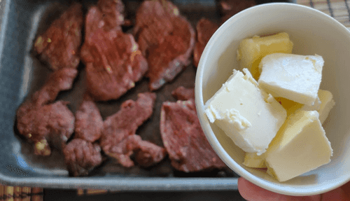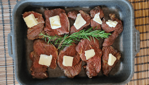 Разложить сливочное масло на каждый кусок мяса и в центре положить две веточки розмарина.