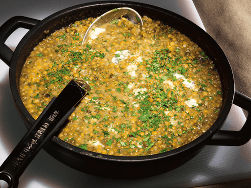 Как только чечевица прогреется так, что начнет слегка побулькивать, ввести в сковороду сок одного лимона, всыпать рубленую петрушку и разобранный на мелкие кусочки ломоть горгонзолы. Тщательно, массирующими движениями перемешать, чтобы расплавленный сыр равномерно распределился в толще чечевицы, и подавать к столу. Солить не нужно. Как правило, горгонзола — достаточно соленый сыр, чтобы натуральной соли не понадобилось.