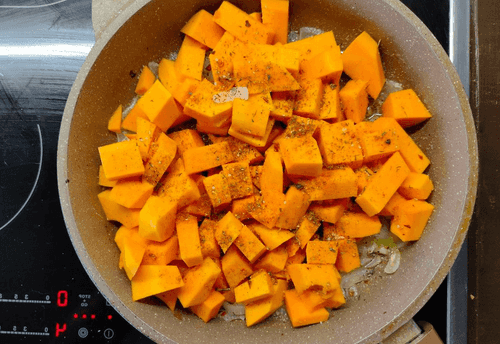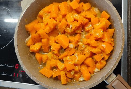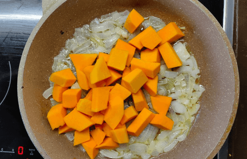Тыкву с луком протушить на среднем огне до готовности (визуально тыква начнет слегка расползаться и станет мягкой).