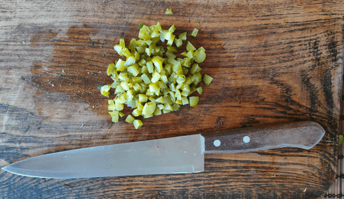 Мелким кубиком нарезать корнишоны.