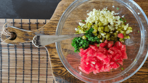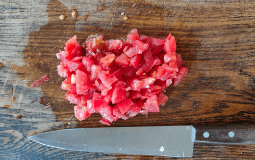 Так же кубиком нарезать помидор.