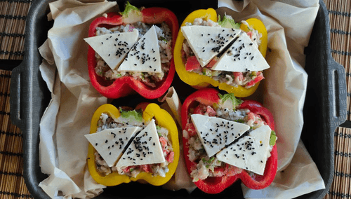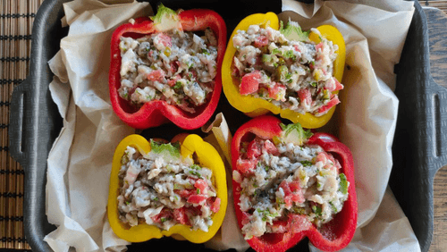 Положить начинку в половинки перцев (при необходимости можно поддержать перцы пекарской бумагой, чтобы они не падали).