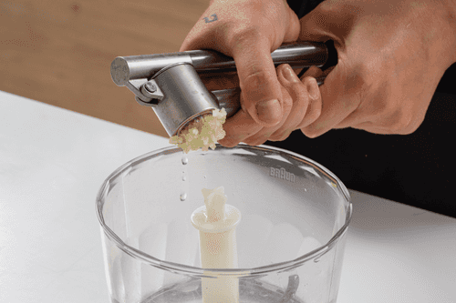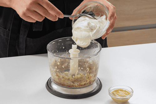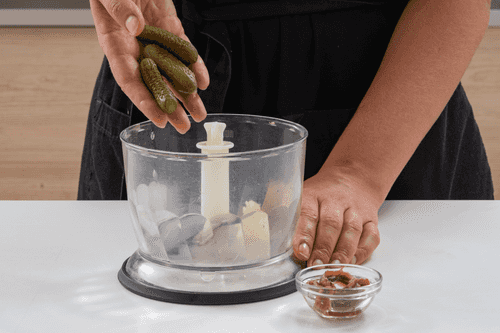 Добавить анчоусы и корнишоны, пробить до однородной пасты.