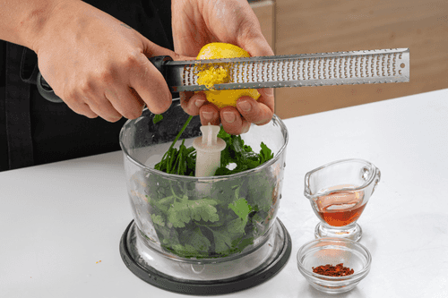 Сложить лук, орегано, петрушку и чеснок в блендер. Добавить цедру лимона.