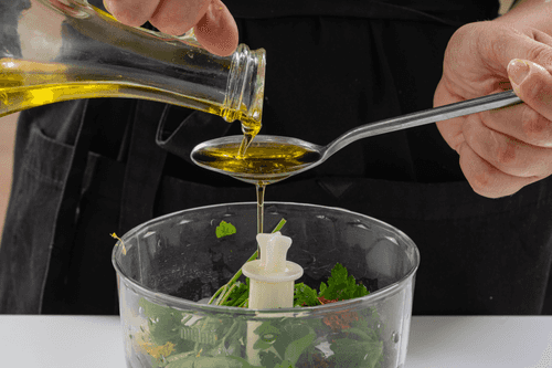 Перемешать все подготовленные ингредиенты для соуса в блендере вместе с оливковым маслом и уксусом, добавить соль и перец по вкусу.