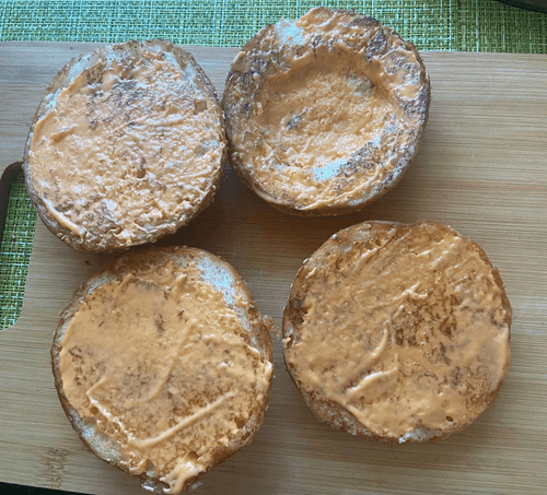 После обжарки необходимо намазать на нижнюю часть булочку готовый бургер-соус или самостоятельно приготовленный.