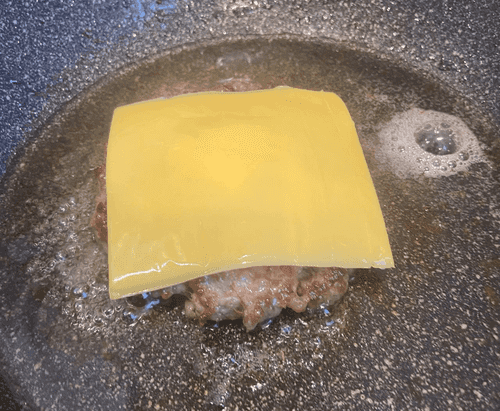 Перевернуть котлету и жарить 1 минуту и 45 секунд, за 30–45 секунд до конца положить на котлету кусочек сливочного масла и сверху накрыть листом плавленого сыра, жарить оставшееся время.