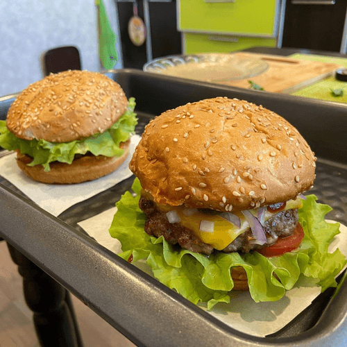 Бургер — легендарное блюдо американской кухни, родившееся в начале XX века. Его основа — сочная говяжья котлета, прожаренная до идеального баланса нежности и румяной корочки. Булочка, хрустящая снаружи и мягкая внутри, аккуратно удерживает слои свежих овощей, пикантного соуса и тянущегося сыра, создавая идеальное сочетание текстур и вкусов. Это блюдо подходит как для быстрого перекуса, так и для уютного семейного ужина. При каждом укусе раскрывается богатая палитра вкусов: сладость томатов, легкая кислинка маринованных огурцов, сливочность сыра и насыщенность мясной котлеты. Его подают во множестве вариаций, но классический бургер остается неизменным символом гастрономического удовольствия, объединяя простоту приготовления и невероятное удовольствие от еды.