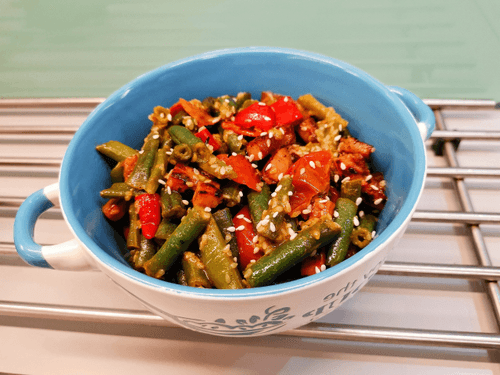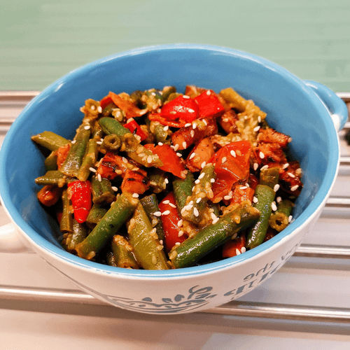 Овощное рагу с колбасой — яркое и ароматное блюдо французской кухни, в котором изысканность сочетается с уютной домашней атмосферой. Считается, что подобные рецепты зародились в сельских районах Франции, где крестьяне готовили питательные блюда из доступных продуктов. В этом варианте рагу свежая зелёная фасоль, сладкие помидоры черри и пикантный маринованный перец гармонично переплетаются с насыщенным вкусом варено-копченой колбасы. Карри-порошок придаёт восточную нотку, а дижонская горчица добавляет глубину вкуса. Оливковое масло и кунжут придают нежную ореховую текстуру, а соевый соус завершает симфонию вкусов. Это блюдо идеально подходит для уютных домашних вечеров, его можно подавать как самостоятельное угощение или как дополнение к рису или свежему багету.