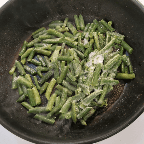 В разогретые на сковороде 3 чайные ложки масла выложить стручковую фасоль.