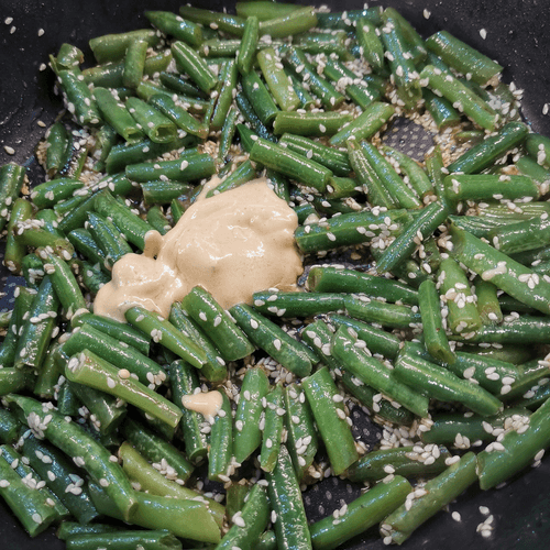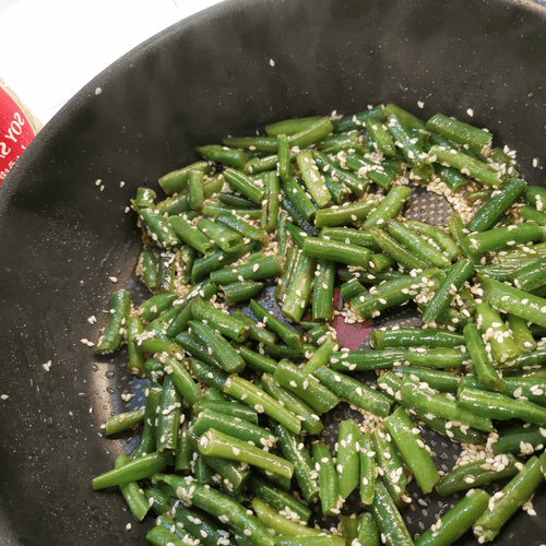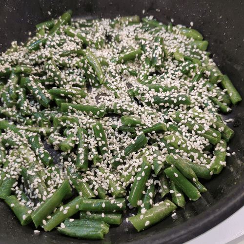 Через 2 минуты перемешать и присыпать кунжутом.