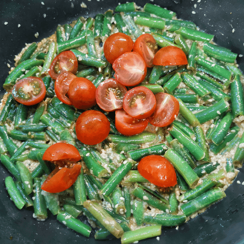 Через 1 минуту добавить разрезанные пополам помидоры черри.