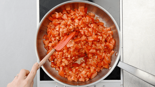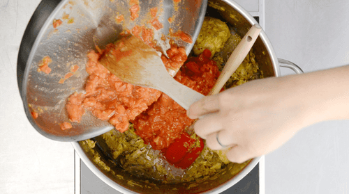 Пока тушится курица, мелко нарезать и потушить помидоры (можно протереть их через дуршлаг) с добавлением томатной пасты.