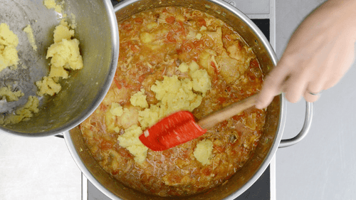 Плотно закрыть крышкой, убавить огонь (должно чуть-чуть булькать). Лук, перец и томаты должны в конце практически раствориться, а куриное мясо — отставать от костей. В блюдо можно добавить отдельно сваренный и протертый картофель.