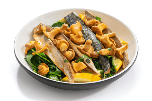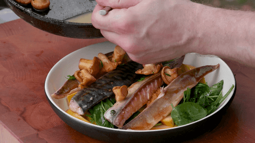 Скумбрия на мангале с кабачками и лисичками
