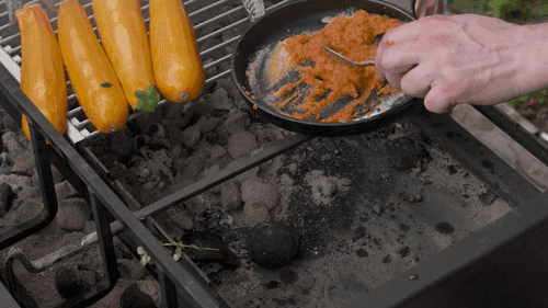 Поставить сковородку с пюре на мангал, чтобы оно не остывало.