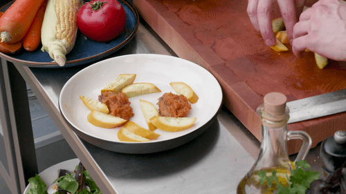 На тарелку выложить пюре из батата, кабачки нарезать толстыми дольками и выложить рядом с бататом, добавить шпинат.