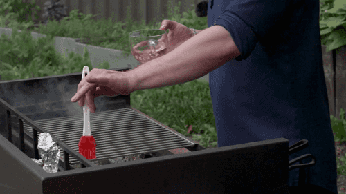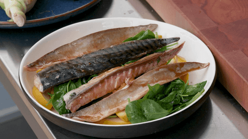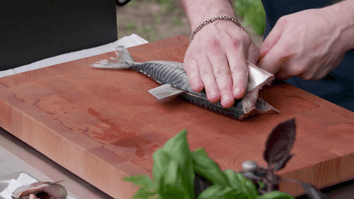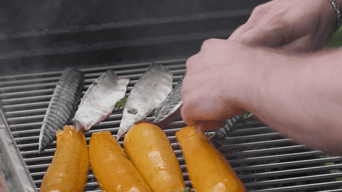 Выложить скумбрию на решетку кожей вверх. Жарить ее около 5 минут.