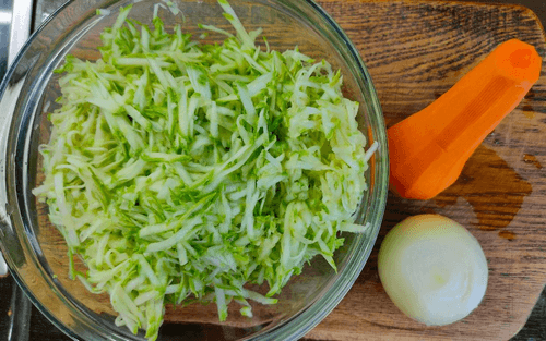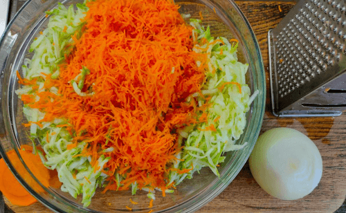 Лук натереть на крупной терке, как и кабачки, и соединить с остальными овощами.
