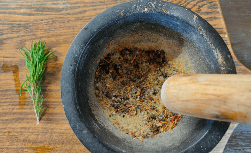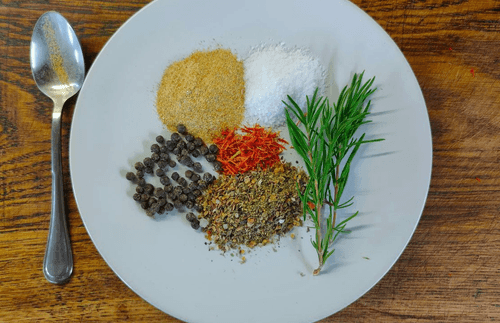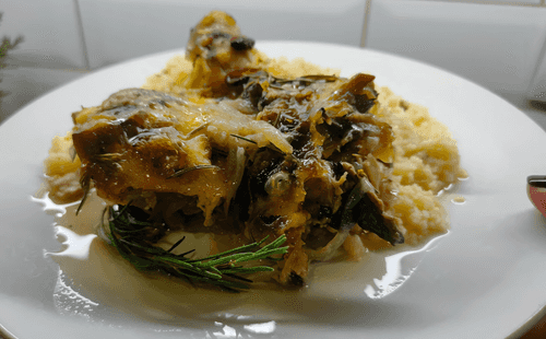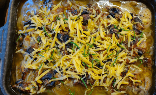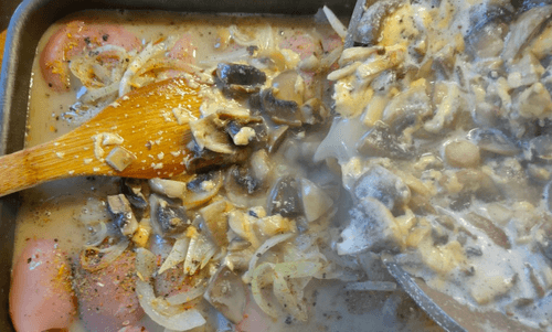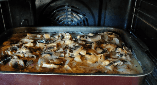 Засыпать курицу смесью растолченных ранее специй и сверху вылить готовую смесь из шампиньонов и лука с сыром.
