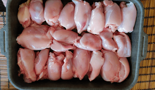 В глубокий противень выложить филе бедра в произвольном порядке.
