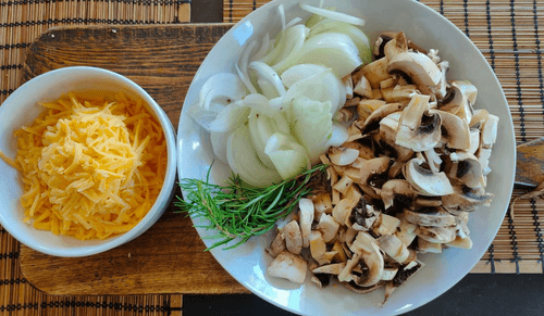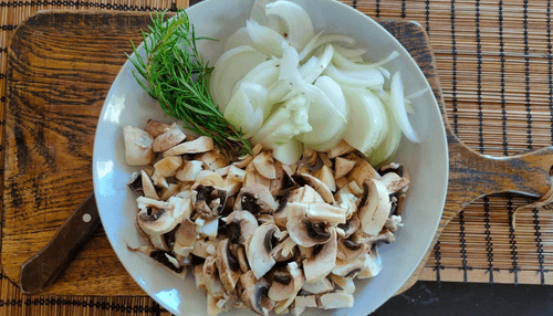 Равномерно распределить грибы с луком, сверху посыпать оставшимся сыром и бросить листья розмарина.