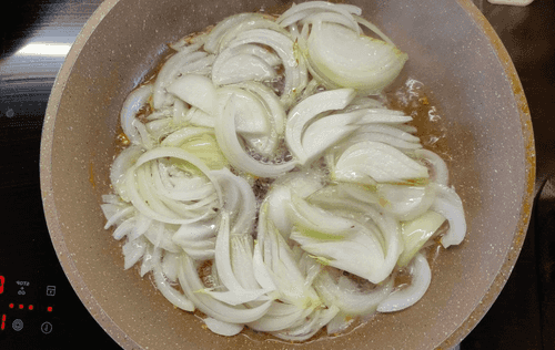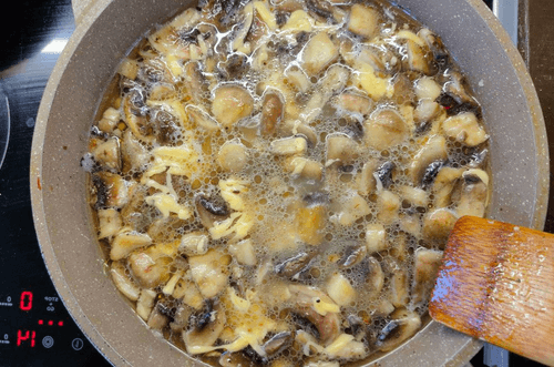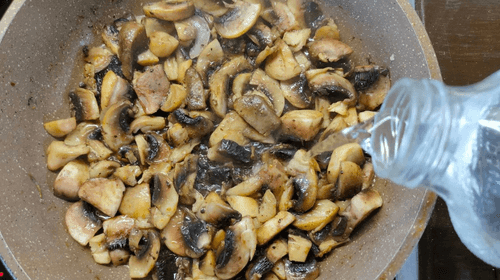 К почти готовому луку добавить шампиньоны и так же обжарить вместе с луком, затем добавить воду.