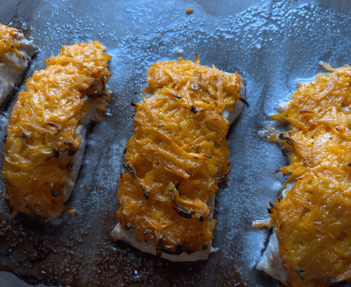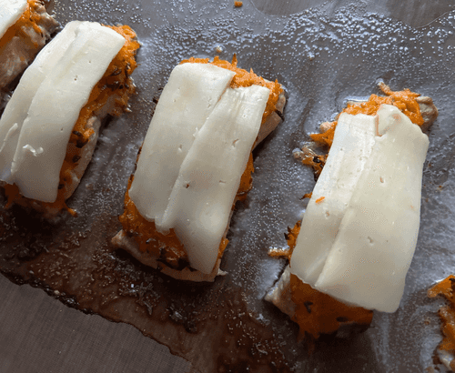 Достать рыбу и выложить сыр.