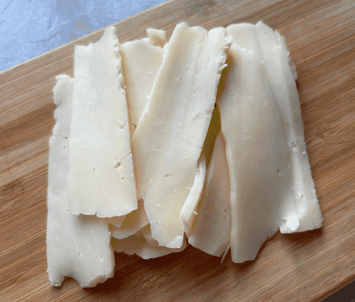 Нарезать сыр на слайсы.