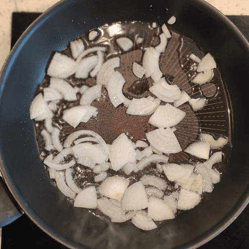 Сковороду хорошо разогреть, налить подсолнечное масло и обжарить лук до полупрозрачности.