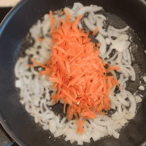 К луку добавить морковь, перемешать и жарить до полуготовности. Отставить через 2 минуты в сторону.